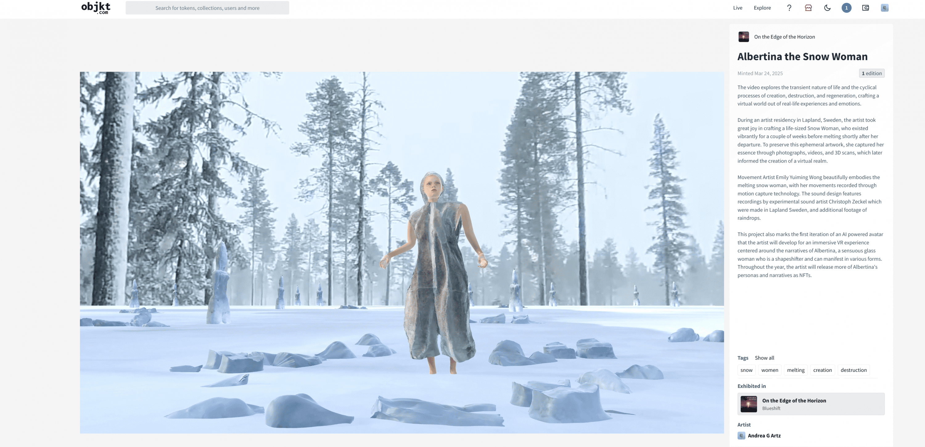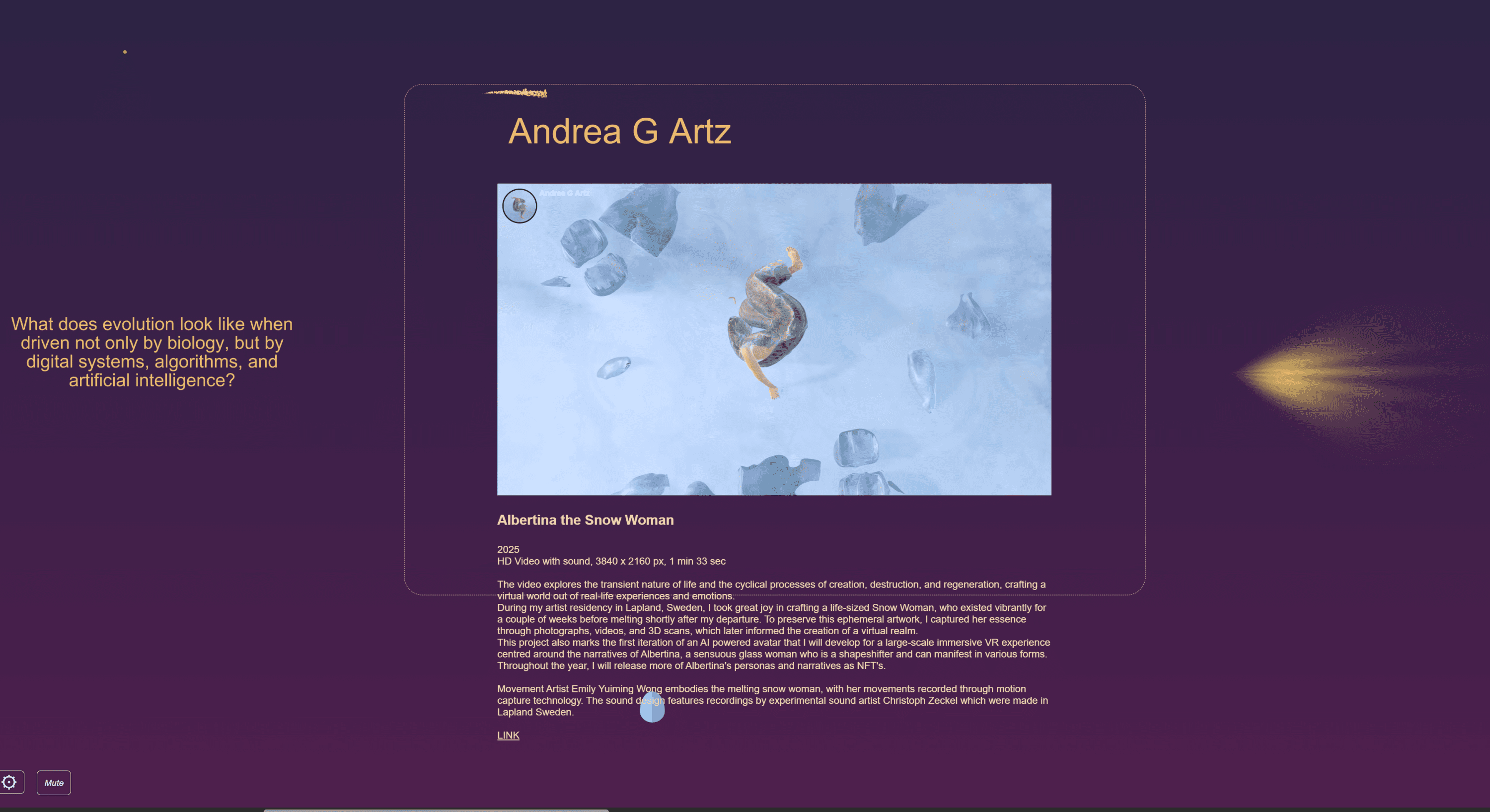 During an artist residency in Lapland, Sweden, I joyfully created a life-sized Snow Woman, who existed vibrantly for a few weeks before melting shortly after my departure. To preserve this ephemeral artwork, I captured her essence through photographs, videos, and 3D scans, which later informed the creation of a virtual realm.